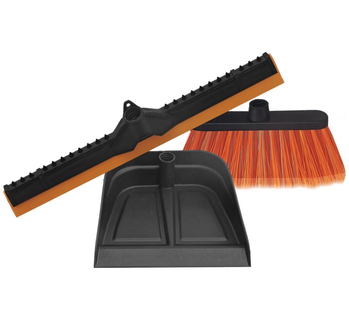 Kit star contém uma vassoura com cabo, um rodo com cabo e uma pá para lixo, cabos com pendurador o que facilita o seu armazenamento e organização do espaço. Ideal para funções básicas de limpeza de mais variados pisos e ambientes.