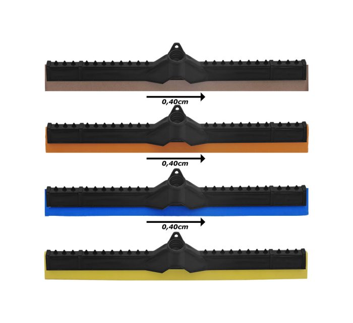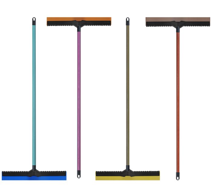 Rodo com cepa plástica preta serrilhada na parte superior para melhor fixação do pano de chão, borracha dupla EVA color para aumentar o poder de secagem dos pisos, cabo em madeira, plastificado com estampas em listras, grande capacidade em remover ou controlar o fluxo de líquido em uma superfície.