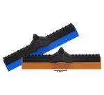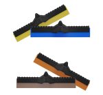 Rodo com cepa plástica preta serrilhada na parte superior para melhor fixação do pano de chão, borracha dupla EVA color para aumentar o poder de secagem dos pisos, cabo em madeira, plastificado com estampas em listras, grande capacidade em remover ou controlar o fluxo de líquido em uma superfície.