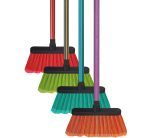 Vassoura com hastes em Nylon 0,30cm, cabo de 1,20m em madeira plastificado com estampas em listras, pendurador longo e rosca plástica.
