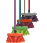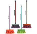 Vassoura com capa e hastes em Nylon 0,30cm, cabo de 1,20m em madeira plastificado com estampas em listras, pendurador longo e rosca plástica.